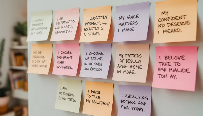 Minutes 4-6: Say each affirmation three times while making eye contact with yourself in a mirror. This feels wildly uncomfortable at first. Do it anyway. The mirror activates different neural pathways than just saying words in your head.